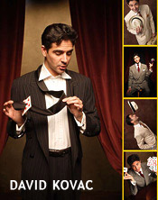 Based in Chicago for over a decade, David Kovac has presented his Random Acts of Magic in every kind of venue from the popular Millennium Park and Navy Pier to the stages of Second City and the legendary Green Mill. The Chicago Tribune named him one of their Top Five Trickster Heroes, referring to him as “a Wizard of Odd who places art before effect and turns simple tricks into theatrical presentations ...” Click on left photo to view his bio kit.